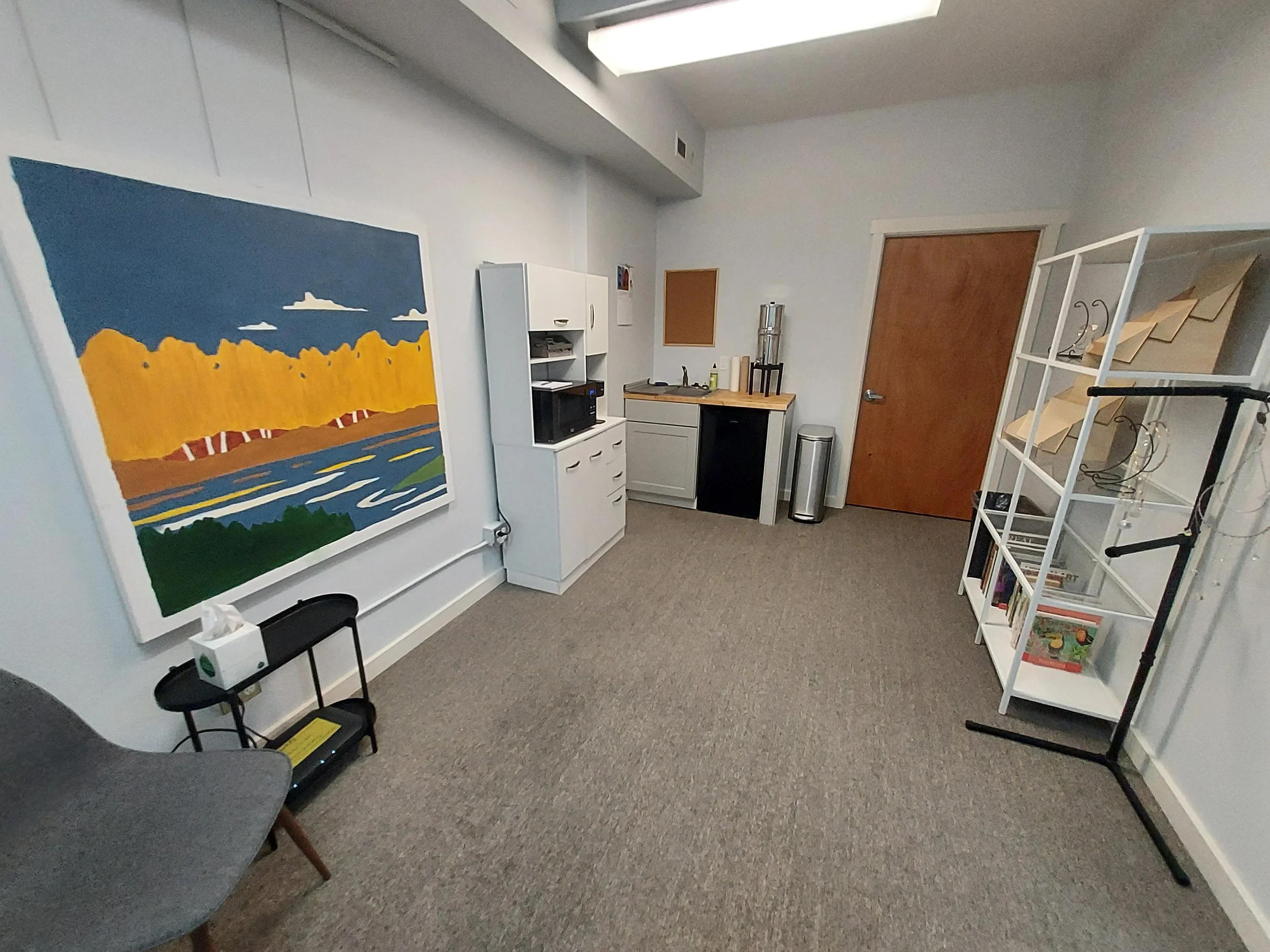 The Skagit Studios offers 850 square feet of shared creative space, including a small lounge, kitchenette, and restroom. There are spaces dedicated to spreading out a mixed media project, working at an easel, or settling into a private desk station.